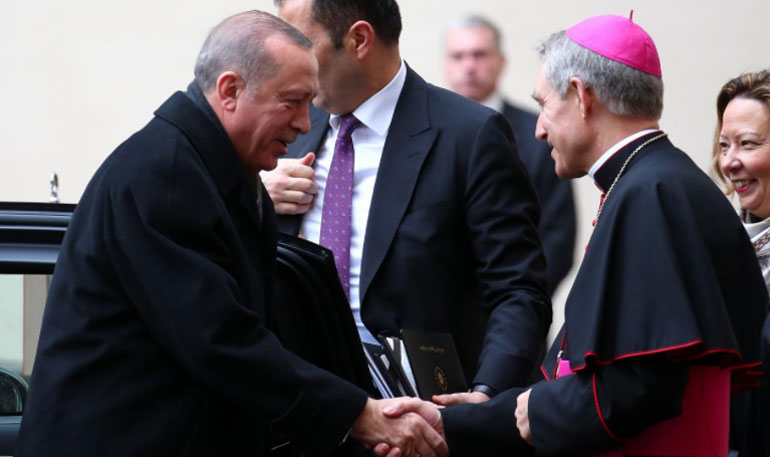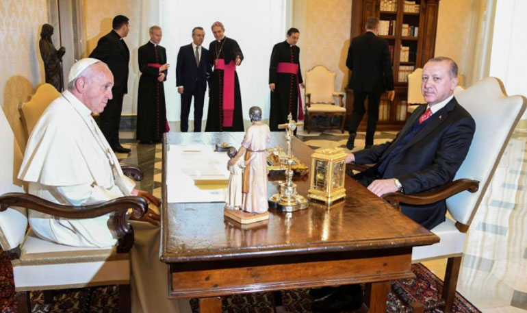 Πενήντα λεπτά διήρκεσε σήμερα το πρωί η συνάντηση του πάπα Φραγκίσκου με τον Τούρκο πρόεδρο Ρετζέπ Ταγίπ Ερντογάν, στην βιβλιοθήκη του Βατικανού. Τον τούρκο πρόεδρο συνόδευαν, μεταξύ άλλων, η σύζυγός του Εμινέ, η κόρη του Έσρα, και πέντε υπουργοί της τουρκικής κυβέρνησης.