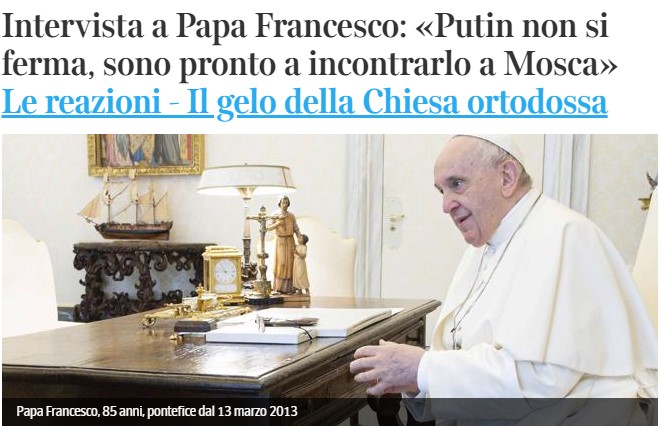 Ο Πάπας τόνισε πως «δεν πρόκειται να πάω στο Κίεβο προς το παρόν εφόσον νιώθω ότι δεν πρέπει να πάω». Πρώτα πρέπει να πάω στη Μόσχα, να συναντήσω τον Πούτιν. Είμαι όμως ένας Παπάς, τι να κάνω; Ό,τι μπορώ κάνω. Αν ο Πούτιν άνοιγε την πόρτα…».