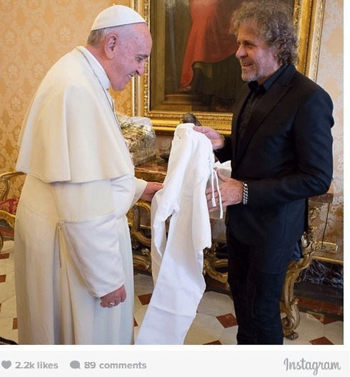 Στη παρακάτω φωτογραφία, απεικονίζεται ο Πάπας Φραγκίσκος μαζί με τον σχεδιαστή της Diesel, Nicola Formichetti.