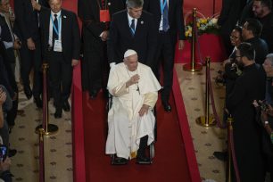 Κατά την προσγείωση του αεροσκάφους του το απόγευματης Παρασκευής (22/9), ο προκαθήμενος της Ρωμαιοκαθολικής Εκκλησίας έγινε δεκτός από την Γαλλίδα πρωθυπουργό Ελιζαμπέτ Μπορν. Ενώ καθόταν σε αναπηρικό αμαξίδιο, ο Φραγκίσκος σηκώθηκε κατά τη διάρκεια της ανάκρουσης των εθνικών ύμνων, προτού χαιρετήσει χαμογελώντας τους επίσημους που βρίσκονταν εκεί.