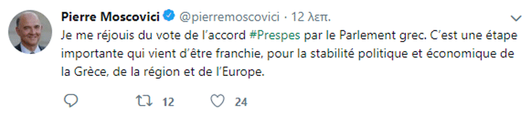 Την κύρωση της Συμφωνίας των Πρεσπών από τη Βουλή των Ελλήνων χαιρετίζει, μέσω twitter, o Ευρωπαίος επίτροπος, αρμόδιος για θέματα Οικονομίας, Πιέρ Μοσκοβισί.