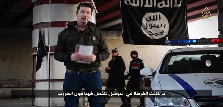 Ο άτυχος δημοσιογράφος υποχρεώνεται να μεταδίδει με χαμόγελο ότι του λένε οι τζιχαντιστέςΟ άτυχος δημοσιογράφος –αλλά και τυχερός μιας και ζει ακόμα, σε αντίθεση με τους άλλους συναδέλφους του που απήχθησαν- υποχρεώνεται να έχει τον άχαρο ρόλο της μετάδοσης των μηνυμάτων του Ισλαμικού Χαλιφάτου, ακόμα και του… ρεπορτάζ, είτε από το Κομπανί, όπου μέχρι και σήμερα μαίνονται οι μάχες, είτε από τη Μοσούλη του Ιράκ, το βασικό προπύργιο των τζιχαντιστών που ελέγχεται πλήρως από αυτούς. Έκκληση για την απελευθέρωσή του είχε απευθύνει ο πατέρας του δημοσιογράφου, λίγες εβδομάδες πριν φύγει από τη ζωή.