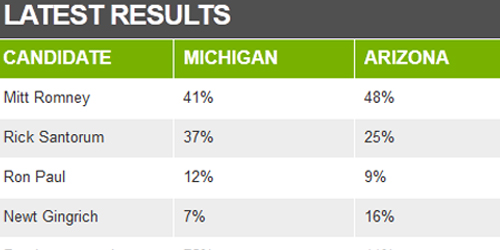 O Mitt Romney επιβεβαίωσε τα προγνωστικά για επικράτησή του στην προκριματική ψηφοφορία των Ρεπουμπλικάνων στην πολιτεία Αριζόνα. Όπως μεταδίδει το αμερικανικό τηλεοπτικό δίκτυο CNN ο πρώην κυβερνήτης της Μασαχουσέτης συγκεντρώνει το 48% των ψήφων έναντι 25% του βασικού του αντιπάλου, Rick Santorum. Ακολουθούν ο πρώην πρόεδρος της Βουλής των Αντιπροσώπων, Newt Gingrich με 16% και ο βουλευτής από το Τέξας, Ron Paul με 9%.