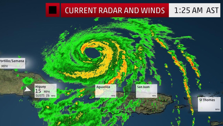Σύμφωνα με τις πρώτες πληροφορίες ο τυφώνας Ίρμα κατηγορίας 5 το βράδυ της Τετάρτης χτύπησε το βόρειο τμήμα του Πουέρτο Ρίκο με την ταχύτητα του ανέμου να φθάνει τα 295 χλμ./ώρα αλλά το μάτι του κυκλώνα παρέμεινε μακριά στον θαλάσσιο χώρο που περιβάλει το νησί. Τα 3 εκατ. κατοίκων του Πουέρτο Ρίκο έμειναν χωρίς ηλεκτρικό και τα ποτάμια βγήκαν από τις κοίτες τους πλημμυρίζοντας το κεντρικό και βόρειο κομμάτι του νησιού.