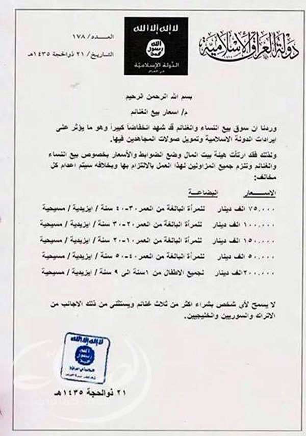 -Γιεζίντι ή χριστιανές ηλικίας μεταξύ 10-20 ετών πωλούνται προς 130 αμερικανικά δολάρια η μία.