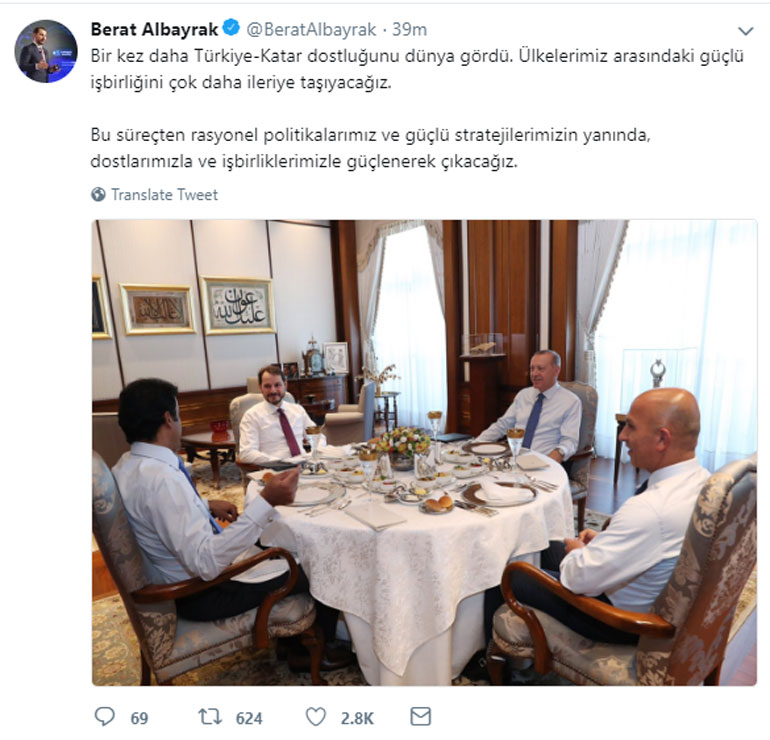 Με μήνυμά του στο Twitter, ο Αλμπαϊράκ διαβεβαίωσε ότι «η Τουρκία θα αναδυθεί σθεναρότερη από την τρέχουσα οικονομική κατάσταση, εφαρμόζοντας ορθολογικές πολιτικές, αποφασιστικές στρατηγικές και με τη βοήθεια φίλων και της συνεργασίας».