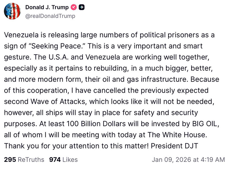 «Η Βενεζουέλα απελευθερώνει μεγάλο αριθμό πολιτικών κρατουμένων ως ένδειξη «αναζήτησης ειρήνης». Πρόκειται για μια πολύ σημαντική και έξυπνη κίνηση. Οι Η.Π.Α. και η Βενεζουέλα συνεργάζονται καλά, ειδικά όσον αφορά την ανασυγκρότηση, σε μια πολύ μεγαλύτερη, καλύτερη και πιο σύγχρονη μορφή, των υποδομών πετρελαίου και φυσικού αερίου. Λόγω αυτής της συνεργασίας, ακύρωσα τη δεύτερη σειρά επιθέσεων που είχε προγραμματιστεί, η οποία φαίνεται ότι δεν θα χρειαστεί, ωστόσο, όλα τα πλοία θα παραμείνουν στη θέση τους για λόγους ασφάλειας. Τουλάχιστον 100 δισεκατομμύρια δολάρια θα επενδυθούν από τις μεγάλες πετρελαϊκές εταιρείες, με τις οποίες θα συναντηθώ σήμερα στον Λευκό Οίκο. Σας ευχαριστώ για την προσοχή σας σε αυτό το θέμα! Πρόεδρος DJT».