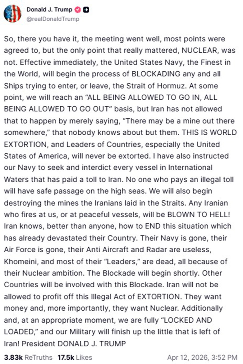 «Λοιπόν, ορίστε, η συνάντηση πήγε καλά, συμφωνήσαμε στα περισσότερα σημεία, αλλά στο μοναδικό σημείο που είχε πραγματικά σημασία, τα ΠΥΡΗΝΙΚΑ, όχι. Με άμεση ισχύ, το Πολεμικό Ναυτικό των Ηνωμένων Πολιτειών, το Καλύτερο στον Κόσμο, θα ξεκινήσει τη διαδικασία ΑΠΟΚΛΕΙΣΜΟΥ κάθε πλοίου που προσπαθεί να εισέλθει ή να εξέλθει από τα Στενά του Ορμούζ. Κάποια στιγμή, θα φτάσουμε σε μια φάση όπου “ΟΛΟΙ ΘΑ ΕΠΙΤΡΕΠΕΤΑΙ ΝΑ ΜΠΑΙΝΟΥΝ, ΟΛΟΙ ΘΑ ΕΠΙΤΡΕΠΕΤΑΙ ΝΑ ΒΓΑΙΝΟΥΝ”, αλλά το Ιράν δεν επέτρεψε να συμβεί αυτό λέγοντας απλώς, “μπορεί να υπάρχει μια νάρκη κάπου εκεί έξω”, την τοποθεσία της οποίας κανείς δεν γνωρίζει εκτός από αυτούς.