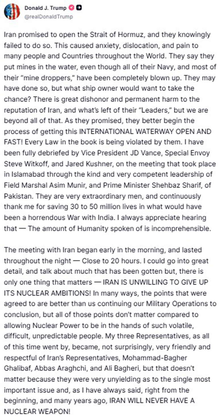 Ενημερώθηκα πλήρως από τον Αντιπρόεδρο, JD Vance, τον Ειδικό Απεσταλμένο, Steve Witkoff και τον Jared Kushner, για τη συνάντηση που πραγματοποιήθηκε στο Ισλαμαμπάντ, μέσω της ευγενούς και πολύ ικανής ηγεσίας του Στρατάρχη Asim Munir και του Πρωθυπουργού Shehbaz Sharif του Πακιστάν. Είναι εξαιρετικοί άνδρες και με ευχαριστούν συνεχώς που έσωσα 30 έως 50 εκατομμύρια ζωές σε αυτό που θα ήταν ένας τρομερός πόλεμος με την Ινδία. Πάντα εκτιμώ να το ακούω αυτό – το μέγεθος της Ανθρωπιάς για την οποία μιλάμε είναι ασύλληπτο.