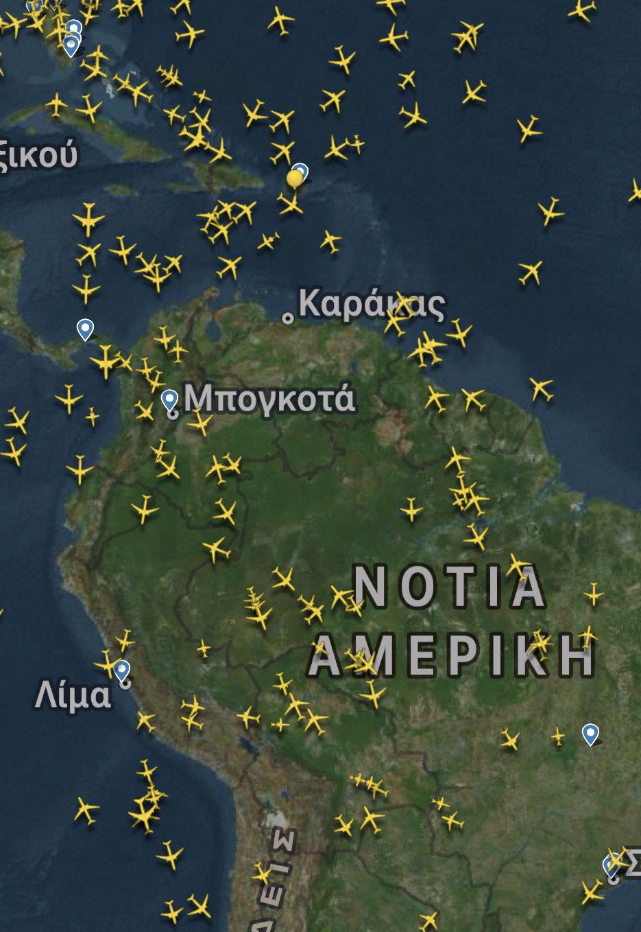 Πλέον καμία πτήση δεν πραγματοποιείται πάνω από τον εναέριο χώρο της Βενεζουέλας, όπως φαίνεται και από τους ακόλουθους χάρτες, από τα Flight Radars.