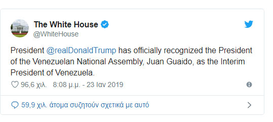 Τον Χουάν Γκουαϊδό, τον πρόεδρο της Εθνοσυνέλευσης της Βενεζουέλας αναγνώρισε επίσημα ως τον ενδιάμεσο πρόεδρο της χώρας, σύμφωνα με ανάρτηση στο twitter του Λευκού Οίκου...