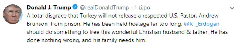 «Είναι απόλυτη ντροπή το ότι η Τουρκία δεν θα αποφυλακίσει τον σεβάσμιο Αμερικανό πάστορα Άντριου Μπράνσον», ο οποίος «κρατείται όμηρος για πάρα πολύ καιρό», ανέφερε ο Τραμπ μέσω Twitter.