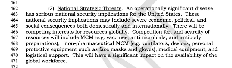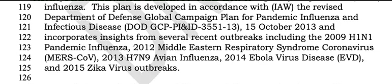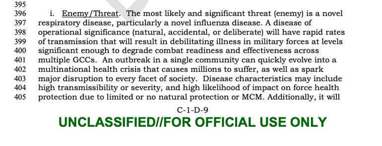 «Η πιο πιθανή και σημαντική απειλή είναι μια νέα αναπνευστική ασθένεια, ειδικά μια νέα ασθένεια γρίπης» αναφέρει το στρατιωτικό σχέδιο. Ο Covid-19 είναι μια αναπνευστική ασθένεια που προκαλείται από έναν νέο -δηλαδή νέο για τον ανθρώπινο οργανισμό- κορωνοϊό. Το σχέδιο μάλιστα αναφέρει τον «κορωνοϊό» σε αρκετές περιπτώσεις, ενώ χαρακτηριστικά σημειώνεται πως «οι μολύνσεις από κορωνοϊό είναι πολύ κοινές σε όλο τον κόσμο».