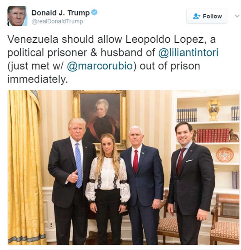 «Η Βενεζουέλα πρέπει να επιτρέψει στον Λεοπόλντο Λόπεζ, πολιτικό κρατούμενο και σύζυγο της Λίλιαν Τιντόρι, να βγει από τη φυλακή άμεσα» έγραψε ο Τραμπ σε ανάρτησή του στο Twitter.