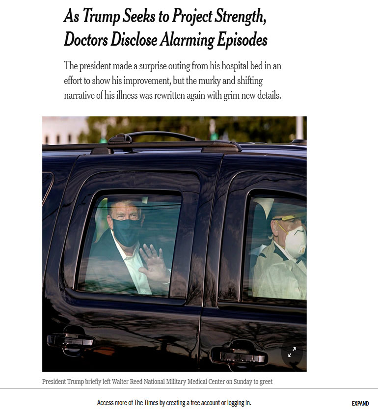 Όλα αυτά συμβαίνουν τη στιγμή που ο Ντόναλντ Τραμπ εξήλθε για λίγο από το νοσοκομείο επιβαίνοντας σε ένα τζιπ, φορώντας μάσκα αλλά χωρίς γραβάτα, και έκανε έναν κύκλο γύρω από το στρατιωτικό νοσηλευτικό ίδρυμα προκειμένου να χαιρετήσει συγκεντρωμένους οπαδούς του. Η κίνηση αυτή προκάλεσε την οργή των ΜΜΕ αλλά και του ιατρικού κόσμου, διότι ο Αμερικανός πρόεδρος προφανώς για προεκλογικούς λόγους έθεσε σε κίνδυνο ιατρικό προσωπικό, πολίτες, νοσηλευτές και άνδρες της ασφάλειάς του, αλλά και τον ίδιο του τον εαυτό.
