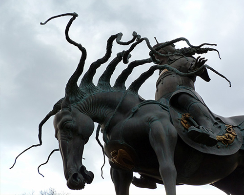 Είναι έργο του Ρώσου γλύπτη, Ντάσι Ναμντάκοφ και δείχνει τον ισχυρό άνδρα της Μογγολίας να ιππεύει ένα άλογο το οποίο κατεβαίνει από τον ουρανό. Ο ίδιος ο καλλιτέχνης ανέφερε πως η επιλογή του συγκεκριμένου θέματος απορρέει από τον μεγάλο θαυμασμό του προς το πρόσωπό του Τζένγκις Χαν. «Ο λόγος που επέλεξα αυτή τη σύνθεση οφείλεται καθαρά στο γεγονός πως ο Τζένγκις Χαν ήταν κάτι παραπάνω από ένας πολέμαρχος. Αν ήθελα να τον αναπαραστήσω ως τέτοιον, θα επέλεγα κάτι άλλο. Ωστόσο στη συγκεκριμένη περίπτωση είναι στοχαστής», εξήγησε.