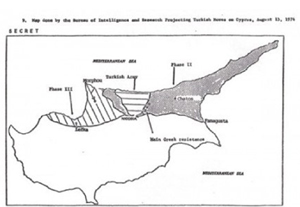 13 Αυγούστου του 1974: Στα γραφεία της CΙΑ -και σε στενή συνεργασία με το επιτελείο του Κίσιντζερ, συμπεριλαμβανομένου και του νομικού του συμβούλου Χέλμουντ Σόνενφελτ- τα μέλη της ομάδας Βureau of Ιntelligence and Research, που ασχολούνταν με την «Κυπριακή Κρίση», όπως είχε χαρακτηριστεί η εισβολή, σχεδίασαν έναν χάρτη με τον αριθμό 9. Ήταν ο ένατος μιας σειράς χαρτών που απεικόνιζαν τις κινήσεις των τουρκικών στρατευμάτων από την 20ή Ιουλίου 1974, όταν άρχισε η εισβολή, μέχρι εκείνη την ημέρα, τη 13η Αυγούστου. Την επόμενη ημέρα, πραγματοποιήθηκε η δεύτερη εισβολή, που ολοκλήρωσε την τραγωδία. Οι οκτώ χάρτες καταστράφηκαν και ο ένατος διασώθηκε, επειδή ο Κίσιντζερ είχε μία κακή, όπως αποδείχθηκε, συνήθεια να κρατά στο προσωπικό του αρχείο μερικά από τα σημειώματα των συνεργατών του. Η λεζάντα στον χάρτη έγραφε τα εξής: «9. Map done by the Bureau of Intellegence and Research projecting Turkish moves on Cyprus, August 13, 1974. SECRET».