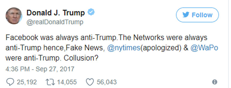 «Το Facebook ήταν πάντα ενάντια στον Τραμπ» έγραψε ο Αμερικανός πρόεδρος στον λογαριασμό του στο Τwitter, αφήνοντας να εννοηθεί ότι ο ιστότοπος «συνωμοτεί» με τις εφημερίδες «Washington Post» και «New York Times», οι οποίες είναι επίσης εναντίον του.