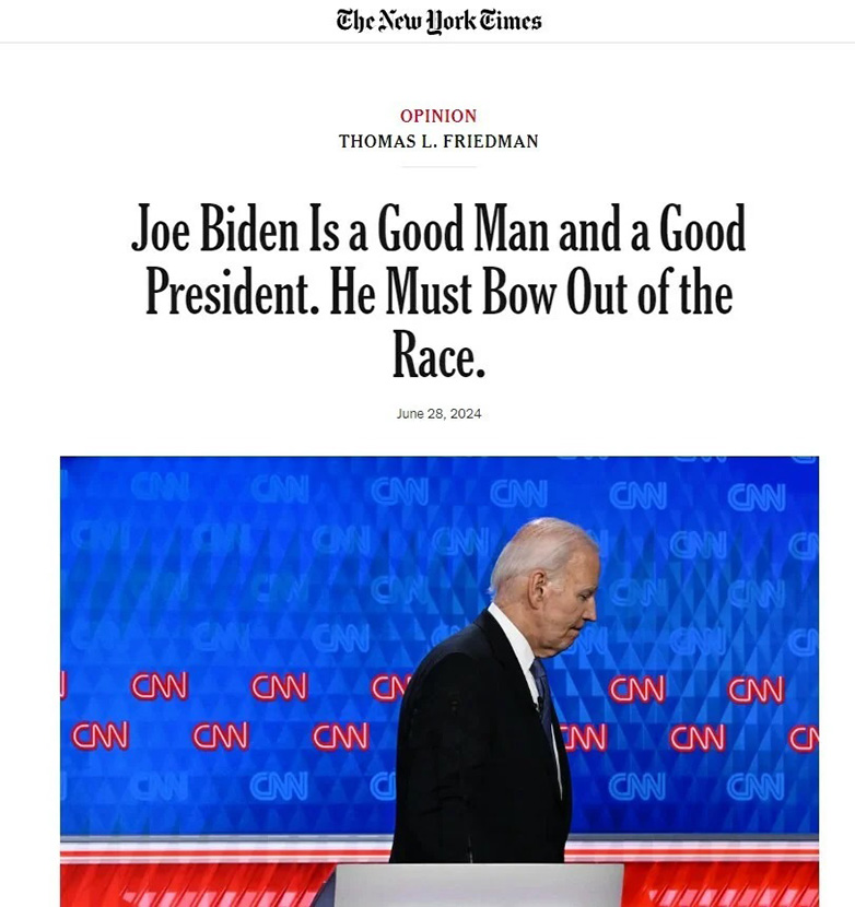 Άρθρο της σύνταξης, που μεταφορτώθηκε στην ψηφιακή έκδοση της εφημερίδας το βράδυ της Παρασκευής, υπό τον τίτλο «Για να υπηρετήσει τη χώρα, ο πρόεδρος Μπάιντεν θα έπρεπε να εγκαταλείψει την κούρσα», περιγράφει τον Δημοκρατικό πρόεδρο με όρους όπως «σκιά ηγέτη» αφού ο αρχηγός του κράτους, 81 ετών, «απέτυχε στη δική του δοκιμασία».