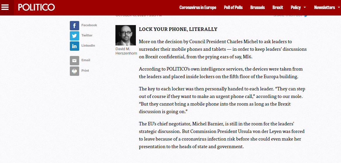 Υπό τον φόβο… παρακολούθησης από τα «αδιάκριτα αυτιά» της MI6, ο Πρόεδρος του Ευρωπαϊκού Συμβουλίου, Charles Michel, κατά τη διάρκεια της Συνόδου Κορυφής, ζήτησε από τους ηγέτες της Ε.Ε να παραδώσουν κινητά και tablets όταν έφθασε η κρίσιμη ώρα της συζήτησης για το Brexit.