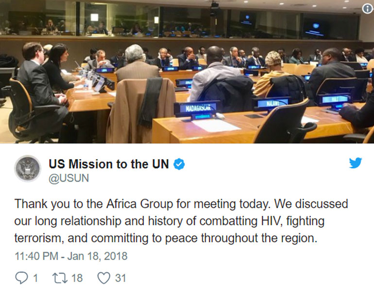 Η αμερικανική αντιπροσωπεία στον ΟΗΕ αρνήθηκε από την πλευρά της να πει αν η Χέιλι έκανε αναφορά στην οργή που προκάλεσαν στην Αφρική οι δηλώσεις του Τραμπ, αλλά ανήρτησε φωτογραφίες από τη συνάντηση, που συνοδεύονταν από το μήνυμα: «Ευχαριστούμε την αφρικανική ομάδα για τη σημερινή συνάντηση».