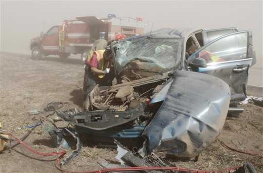 Εκπρόσωπος της Αστυνομίας τόνισε σε δηλώσεις του στο Associated Press πως τουλάχιστον 27 οχήματα συγκρούστηκαν μεταξύ τους λόγω περιορισμένης ορατότητας των οδηγών τους από την ισχυρή ανεμοθύελλα, η οποία έκανε ξαφνικά την εμφάνισή της σε τμήμα του αυτοκινητοδρόμου «Interstate 35» στην επαρχία Κάι. Ελάχιστα λεπτά μετά το τροχαίο προκλήθηκε κομφούζιο καθώς ο δρόμος είχε γεμίσει συντρίμμια εν μέσω αποπνικτικής ατμόσφαιρας.