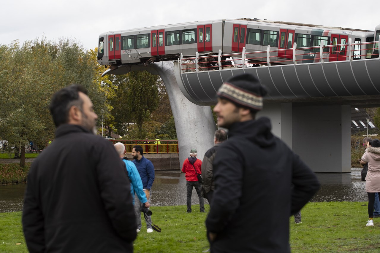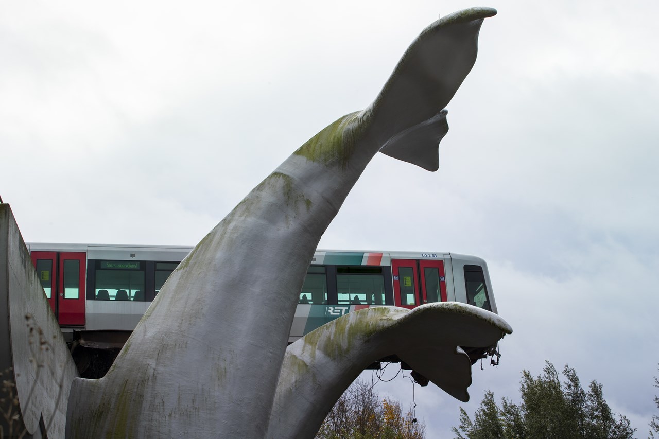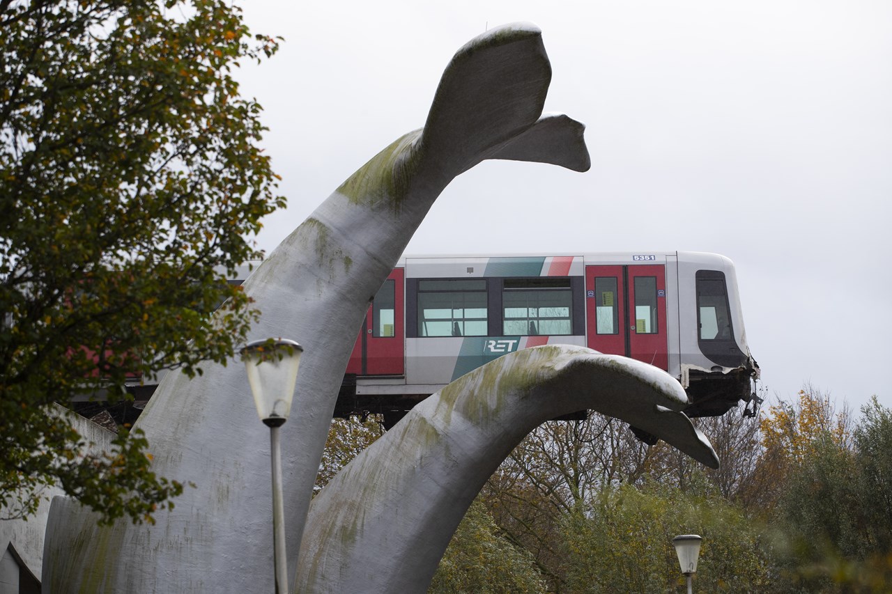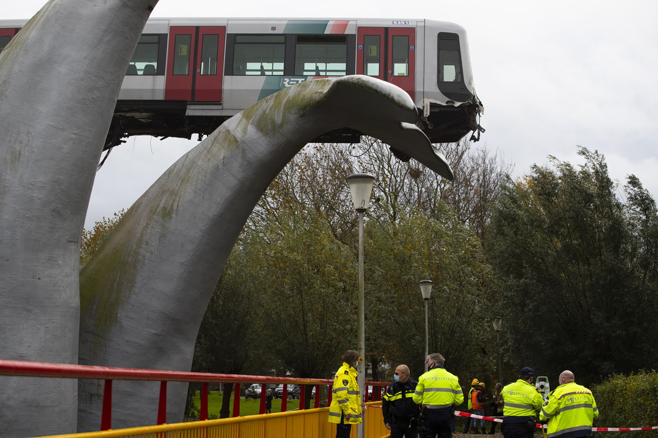Ένας συρμός του μετρό που εκτροχιάστηκε κοντά στο Ρότερνταμ, στην Ολλανδία, «προσγειώθηκε» από θαύμα πάνω σε ένα γλυπτό, που αναπαριστά την ουρά μιας γιγαντιαίας φάλαινας, η οποία και το έσωσε από την καταστροφή.