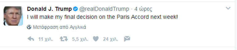 «Παρά τις διαφορετικές προσεγγίσεις μεταξύ της Γαλλίας και των ΗΠΑ για την κλιματική αλλαγή, η Γαλλία θα εξακολουθήσει ν’ ασκεί πιέσεις, αλλά και να αναλαμβάνει πρωτοβουλίες για ζητήματα που άπτονται της αλλαγής του κλίματος».
