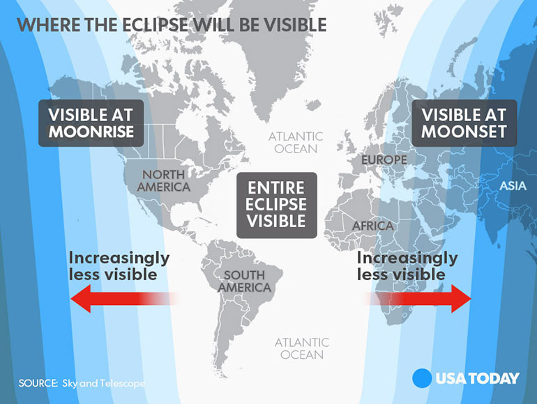 Ενώ η φετινή ανοιξιάτικη ολική έκλειψη διήρκεσε λιγότερο από πέντε λεπτά, της Δευτέρας είχε διάρκεια πάνω από 70 και συνολικά πάνω από τέσσερις ώρες μαζί με την παρασκιά και τη μερική έκλειψη. Είτε με ερασιτεχνικό τηλεσκόπιο είτε με κιάλια είτε με γυμνά μάτια μπορούσε κάποιος να παρακολουθήσει το φαινόμενο.