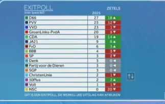 Το φιλοευρωπαϊκό κεντρώο κόμμα D66 αναμένεται να κερδίσει 27 από τις 150 έδρες του κοινοβουλίου, καθώς φαίνεται να προηγείται του Χέερτ Βίλντερς και του ακροδεξιού Κόμματος για την Ελευθερία (PVV), το οποίο αναμένεται να εξασφαλίσει 25, σύμφωνα με τη δημοσκόπηση της Ipsos.