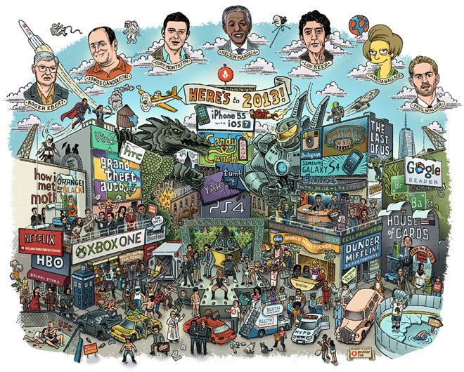 Η εικόνα που θυμίζει έντονα κόμικ Αμερικανικής αισθητικής περιλαμβάνει περίπου 90 γεγονότα, πρόσωπα και αντικείμενα που σημάδεψαν το 2013.