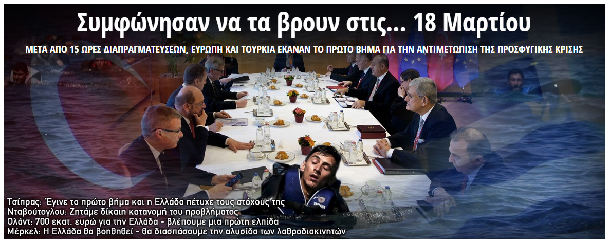 Η Άγκυρα έκανε την πρόταση προς τους 28, σύμφωνα με την οποία η Τουρκία θα δέχεται πίσω όλουςΣτον απόηχο της χθεσινής Συνόδου ο Έλληνας πρωθυπουργός επισκέφτηκε τη Σμύρνη για μπαράζ επαφών, επαναλαμβάνοντας πως το μέλλον των ελληνοτουρκικών σχέσεων περνά μέσα από μεγάλες προκλήσεις τους οικονομικούς μετανάστες, αλλά και τους πρόσφυγες από τη Συρία. Σε αντάλλαγμα, οι Ευρωπαίοι δεσμεύονται να δέχονται μέσω νόμιμων και ασφαλών οδών τον ίδιο αριθμό Σύρων προσφύγων απευθείας από το τουρκικό έδαφος.