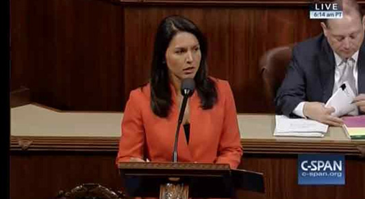 «Αυτή η τρέλα πρέπει να σταματήσει» καταλήγει στην αγόρευσή της καταθέτοντας την τροπολογία η Gabbard. «Η κυβέρνηση πρέπει να σταματήσει την υποκρισία και να τερματίσει να εξοπλίζει τρομοκράτες».
