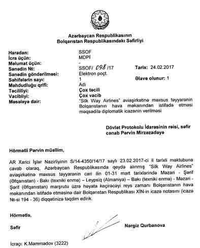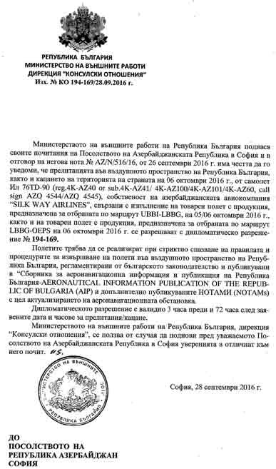 Υπάρχει έγγραφο του βουλγαρικού υπουργείου Εξωτερικών που χορηγεί την εξαίρεση για «διπλωματικούς λόγους». Η κυβέρνηση του Αζερμπαϊτζάν είχε κάνει αίτημα προς τα υπουργεία Εξωτερικών «να κλείσουν τα μάτια» για τις επικίνδυνες αυτές πτήσεις. Αιτήματα είχαν γίνει προς Σερβία, Τσεχία, Ουγγαρία, Σλοβακία. Πολωνία, Τουρκία, Γερμανία, Ηνωμένο Βασίλειο, ΕΛΛΑΔΑ κλπ.