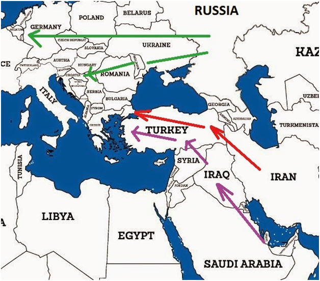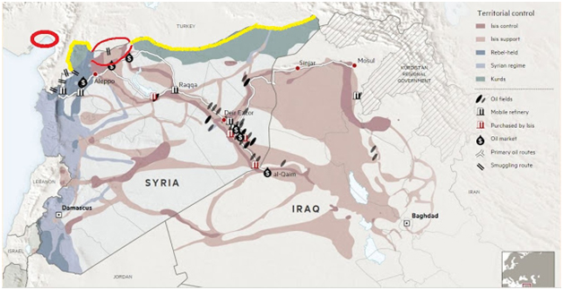 Στον χάρτη διακρίνουμε τη μωβ λωρίδα που ενώνει τις πετρελαιοπηγές που ελέγχονται από το Χαλιφάτο με την Τουρκία. Από το λιμάνι Ceyhan της Τουρκίας στην Μεσόγειο, (σε κόκκινο κύκλο), η Τουρκία ήδη εξάγει πετρέλαιο. Στο Ceyhan καταλήγουν μεγάλες ποσότητες πετρελαίου από τους Κούρδους του Ιράκ, από το Αζερμπαϊτζάν, αλλά και από το IΧ.