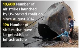 Οι 10.600 αεροπορικές επιδρομές της συμμαχίας των προθύμων υπό τις ΗΠΑ από τον Αύγουστο του 2014 προκάλεσαν 196 πλήγματα στις πετρελαϊκές εγκαταστάσεις του ΙΧ.