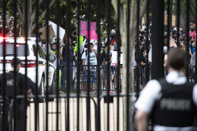 Κρατώντας πλακάτ με συνθήματα όπως «Σταματήστε να μας δολοφονείτε» ή «Η ζωή των μαύρων μετράει», οι διαδηλωτές απαίτησαν «δικαιοσύνη για τον Τζορτζ Φλόιντ» μπροστά στην επίσημη κατοικία του Ντόναλντ Τραμπ.