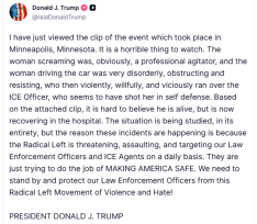 Κατά τον πρόεδρο των ΗΠΑ «ο λόγος για τον οποίο συμβαίνουν αυτά τα περιστατικά είναι επειδή η ριζοσπαστική αριστερά απειλεί, επιτίθεται και στοχεύει καθημερινά τους αξιωματικούς επιβολής του νόμου και τους πράκτορες της ICE. Αυτοί απλώς προσπαθούν να κάνουν τη δουλειά τους, να ΚΑΝΟΥΝ ΤΗΝ ΑΜΕΡΙΚΗ ΑΣΦΑΛΗ. Πρέπει να σταθούμε στο πλευρό των αξιωματικών επιβολής του νόμου και να τους προστατεύσουμε από αυτό το ριζοσπαστικό αριστερό κίνημα βίας και μίσους!».