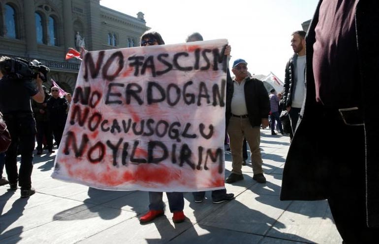 Όπως μετέδωσε νωρίτερα το τουρκικό πρακτορείο Anadolu, περίπου 250 άνθρωποι, μεταξύ αυτών υποστηρικτές του Εργατικού Κόμματος του Κουρδιστάν (PKK), πραγματοποίησαν μια συγκέντρωση σήμερα στη Βέρνη υπέρ του «όχι» στο δημοψήφισμα του Απριλίου, στην Τουρκία.