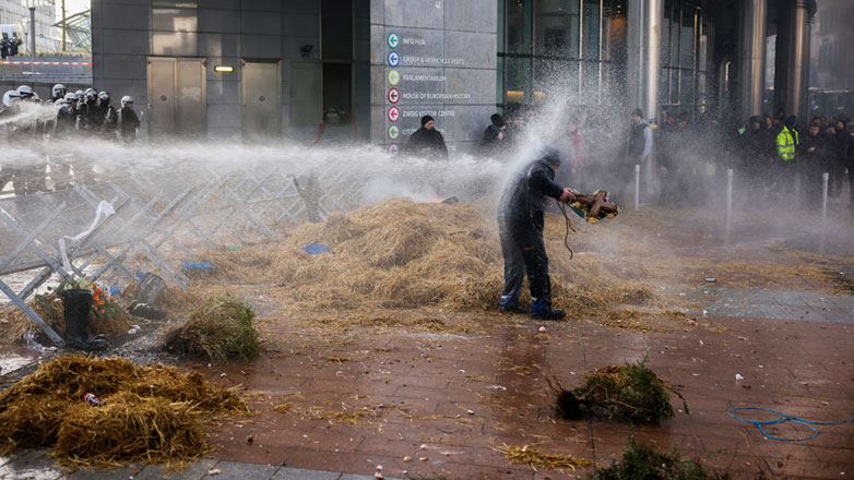 Οι αστυνομικές δυνάμεις που έχουν αποκλείσει την περιοχή προσπαθούν ρίχνοντας νερό με μάνικες να σβήσουν τις φωτιές που έχουν ανάψει περιμετρικά του Ευρωπαϊκού Κοινοβουλίου, οι εξαγριωμένοι διαδηλωτές, αγρότες και κτηνοτρόφοι.