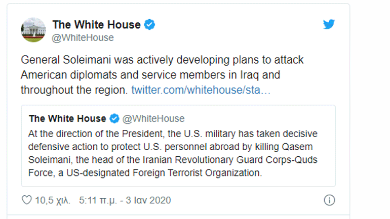 Με διαταγή του προέδρου των ΗΠΑ Ντόναλντ Τραμπ έγινε η εξόντωση του Ιρανού υποστρατήγου Κασέμ Σουλεϊμανί επιβεβαίωσε το αμερικανικό Πεντάγωνο το βράδυ της Πέμπτης (ξημερώματα Παρασκευής, ώρα Ελλάδας).