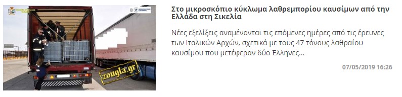 Όπως επισημαίνει στο zougla.gr Ιταλός αξιωματικός που συμμετέχει στις επιχειρήσεις αυτές και συλλέγει τις πληροφορίες, «τα παράνομα φορτία από την Ελλάδα που πιάνουμε είναι πολλά και έχουν αυξητική τάση. Δεν είναι μόνο τα παραποιημένα προϊόντα. Είναι τα τσιγάρα, τα καύσιμα, είναι τρόφιμα παράνομα, ακόμα και ηλεκτρικά είδη μαϊμού. Έχουν μπει στο μικροσκόπιό μας πολλές εταιρείες ενώ ερευνούμε το ενδεχόμενο να υπάρχει και δάκτυλος της Ντραγκέτα και της Καμόρα σε συνεργασία με την Βουλγαρική και την Κινεζική μαφία».