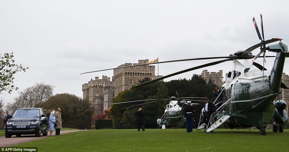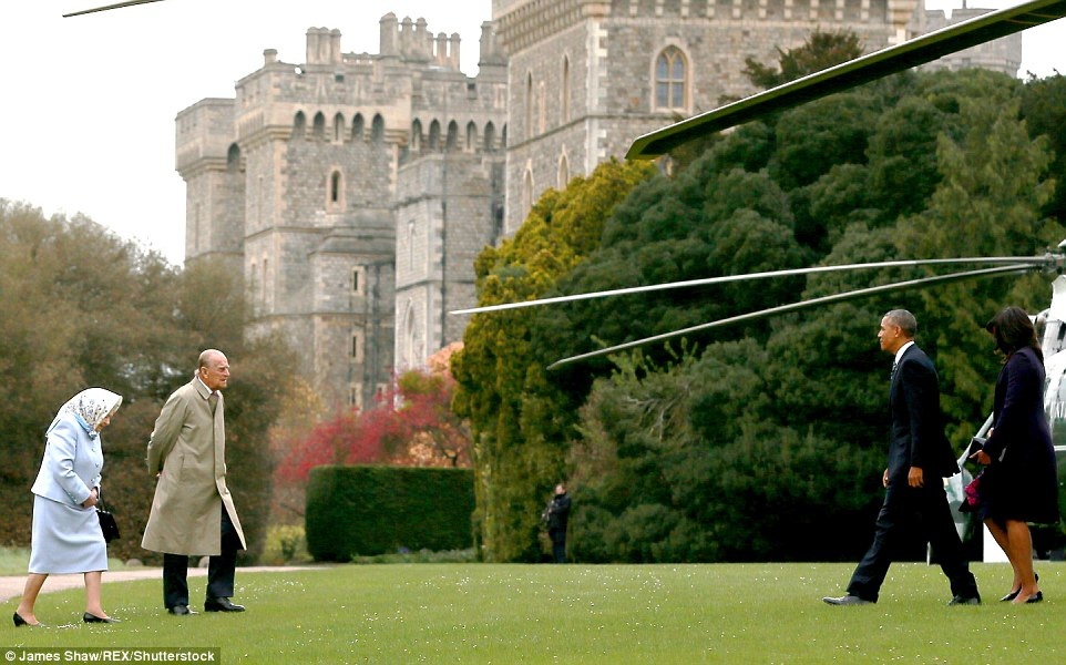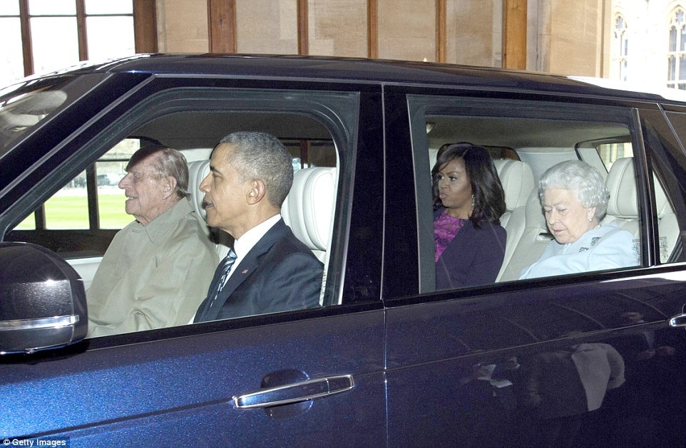 Το ζεύγος Obama πέταξε με το ελικόπτερο Marine One από το Λονδίνο μέχρι το Windsor Castle, όπου τους υποδέχτηκε το βασιλικό ζεύγος. Ο Δούκας του Εδιμβούργου, μάλιστα, παρά το γεγονός ότι διανύει το 94ο έτος της ζωής τους, οδήγησε ο ίδιος το αυτοκίνητο, με το οποίο όλοι τους μεταφέρθηκαν σε εσωτερικό χώρο του κάστρου, όπου γευμάτισαν.