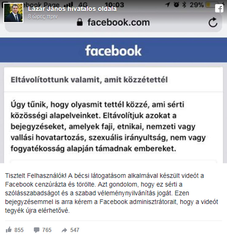 Ο Γιάνος Λάζαρ, τον οποίο χαρακτήρισε «ρατσιστή» την περασμένη εβδομάδα ο Ύπατος Αρμοστής για τα Ανθρώπινα Δικαιώματα, κατηγόρησε το Facebook για λογοκρισία. Σε ένα στιγμιότυπο οθόνης που παρουσίασε, αναφέρεται ότι η ανάρτηση αποσύρθηκε, επειδή παραβίαζε τους κανόνες του ιστότοπου κοινωνικής δικτύωσης.