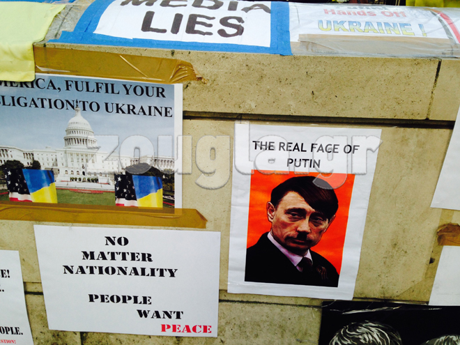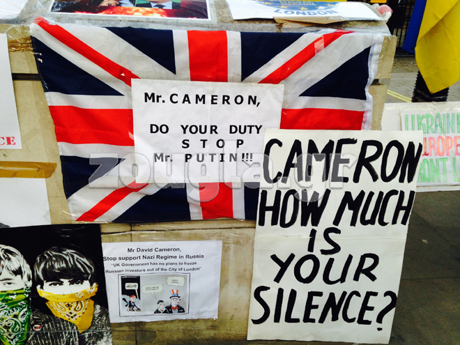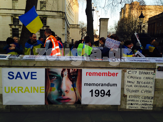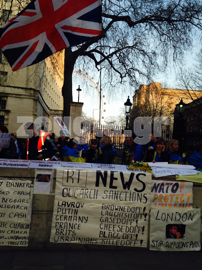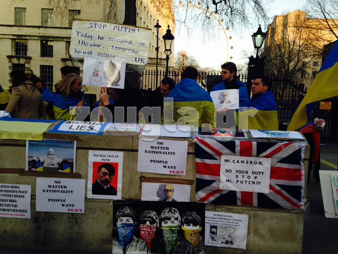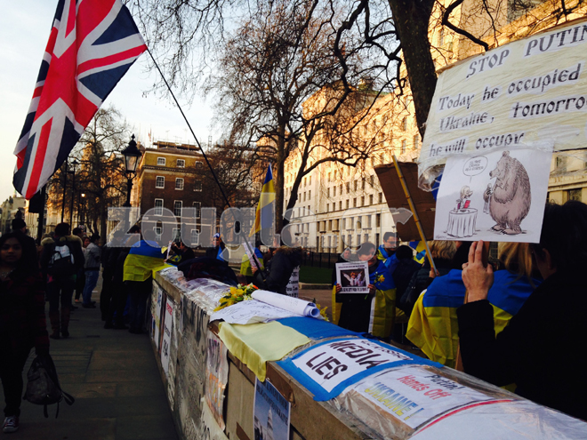 Για όγδοη συνεχή ημέρα Ουκρανοί που διαμένουν στη Βρετανία είναι συγκεντρωμένοι έξω από το σπίτι του πρωθυπουργού της χώρας, Ντέιβιντ Κάμερον, στην Downing Street.