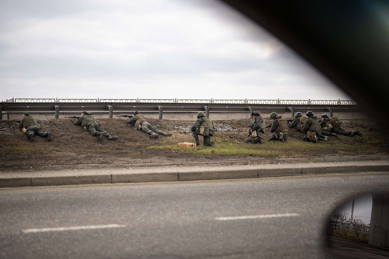 Ο φακός του Associated Press κατέγραψε τους ουκρανούς στρατιώτες στις γωνίες των δρόμων, στα τεχνητά αναχώματα των αυτοκινητοδρόμων και στις γέφυρες της πόλης, με το δάχτυλο στη σκανδάλη.