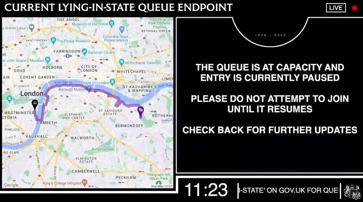 Όπως ανακοίνωσε το αρμόδιο για τη διαχείριση της διαδικασίας υπουργείο Πολιτισμού, το πάρκο δεν χωράει άλλο κόσμο. «Σας παρακαλούμε μην επιχειρήσετε να μπείτε στην ουρά μέχρι να ξανανοίξει», ανέφερε η ανακοίνωση. Ο εκτιμώμενος χρόνος αναμονής για να φτάσουν οι τελευταίοι της ουράς στο Γουέστμινστερ είναι τουλάχιστον 14 ώρες.