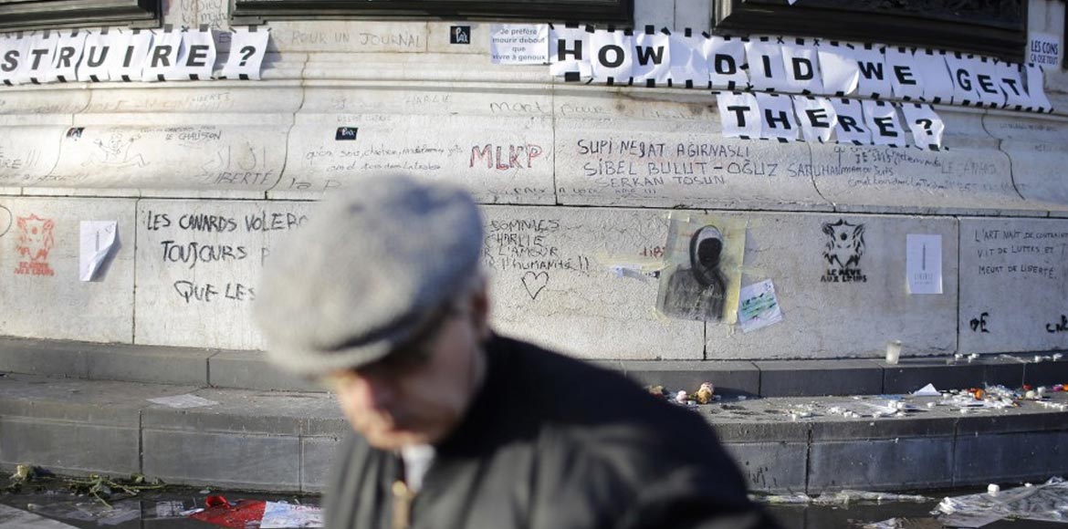 «Να κραδαίνετε τα στιλό σας» ή «Ελευθερία, ισότητα, σχεδιάζετε, γράφετε» είναι μερικά από τα συνθήματα που αναγράφονταν στα πανό των διαδηλωτών, οι οποίοι απέτισαν φόρο τιμής στα 17 θύματα των επιθέσεων που διέπραξαν οι τρεις τζιχαντιστές.