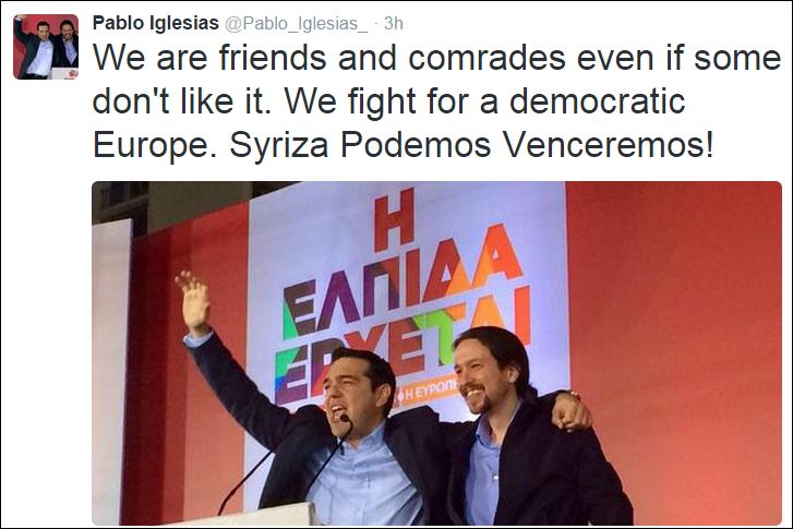 «Σε κάποιους δεν αρέσει, όμως είμαστε φίλοι και σύντροφοι που παλεύουμε για μια δημοκρατική Ευρώπη! SYRIZA PODEMOS VENCEREMOS», έγραψε ο Ιγκλέσιας σε νέα ανάρτηση.