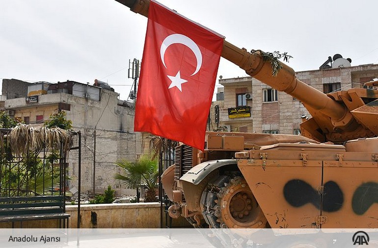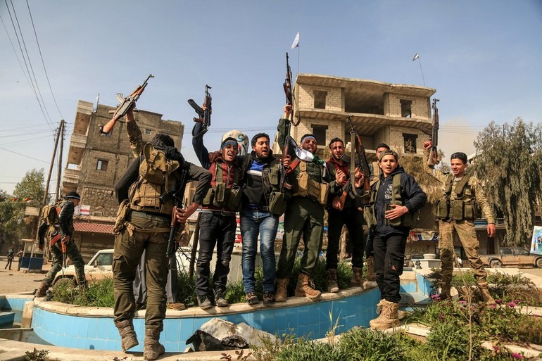 Σχεδόν δυο μήνες μετά την έναρξη της επιχείρησης «Κλάδος Ελιάς» Άραβες παραστρατιωτικοί, Τουρμένιοι , μουσουλμάνοι Κινέζοι Οζγούροι και Τούρκοι στρατιώτες φωτογραφίζονται με την ημισέληνο σε κεντρικά κτήρια μίας άδειας πόλης.